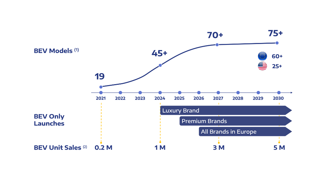 Stellantis has committed to an "aggressive electrification roadmap," with plans to introduce at least 75 battery electric vehicle (BEV) models globally and achieve 100% BEV sales in Europe and 50% in the U.S. by 2030.
